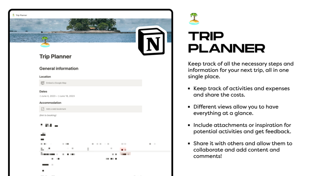 This template should allow you to schedule and plan any upcoming trips you’ve had in mind, centralising all the information in a single place but also allowing you to share it with others that join you or want to go there in the future.